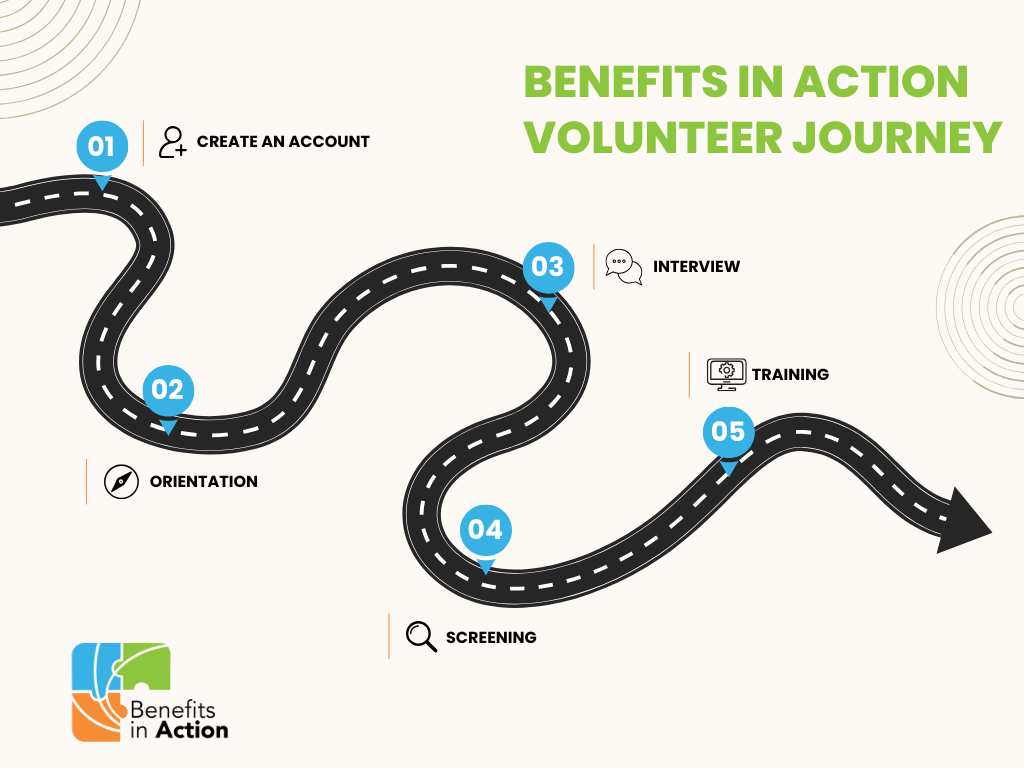 Get started volunteering with Benefits in Action today! See the steps below to start the onboarding process.